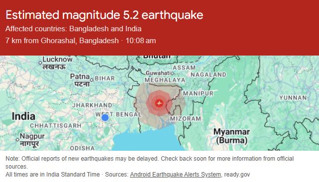 বাংলাদেশ ও ভারতের ত্রিপুরাজুড়ে ভূমিকম্পের কম্পন অনুভূত হয়েছে। শুক্রবার সকাল ১০টা ১০ মিনিট নাগাদ এই ভূমিকম্প হয়। রিক্টার স্কেলে কম্পনের মাত্রা ছিল ৫.২। হঠাৎ কম্পন অনুভূত হওয়ায় আতঙ্কে বহু মানুষ ঘর থেকে বেরিয়ে আসেন।
